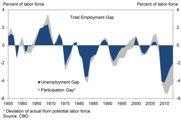 根据高盛的估计和国会预算办公室的估计,目前美国劳动力市场的闲置人数约为570万人,约占144万美国工人的4%。这大约是失业差距的两倍,并考虑了参与率下降和那些已经停止寻找工作的工人。