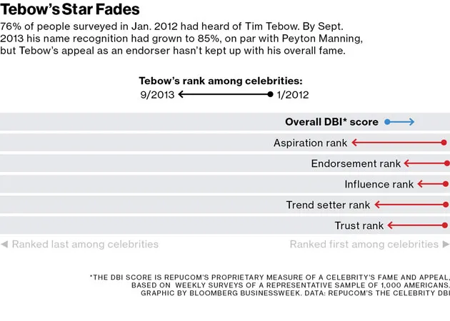 根据市场研究公司Repucom的数据,在那个时候,泰博的名气与迈克尔·乔丹和大卫·贝克汉姆相当,作为名人代言人。他的名字和面孔被超过四分之三的美国公众所熟知,这使他达到了乔·纳马斯的水平。在Repucom的数据库中,只有奥普拉·温弗瑞和凯特·米德尔顿在2300多名名人中拥有更大的影响力。泰博在信任、引领潮流和渴望方面也排名前20,这衡量了调查参与者希望像他一样的程度。年仅24岁,职业生涯短暂,他在美国人的心目中建立了重要的存在。
