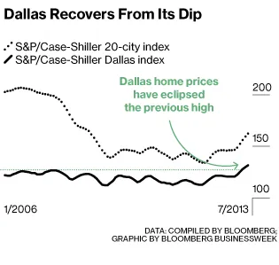 与其他美国市场(如亚利桑那州、佛罗里达州、加利福尼亚州和内华达州)价格飙升不同,德克萨斯州不仅仅是在弥补住房崩溃中失去的地盘。根据联邦住房金融局的数据,该州的房价从2007年的高峰到2011年的低谷下降了约2.5%,而全国范围内的下降幅度为20%。标准普尔/凯斯-希勒20城指数显示,房价仍比2006年的高峰低21%,而达拉斯的房价则比之前的高点高出4%。