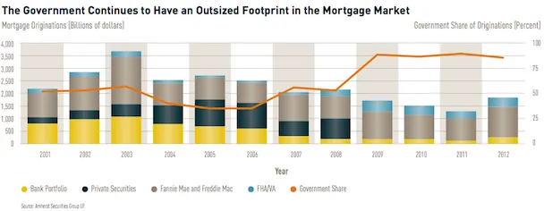 像VA和FHA这样的机构今天负责的贷款份额显著大于2005年和2006年,而由私人市场支持的份额则大幅下降。这张来自2013年国家住房状况报告的图表(橙色线)显示了在房地产崩溃后,联邦政府在抵押贷款市场中的角色是如何飙升的。