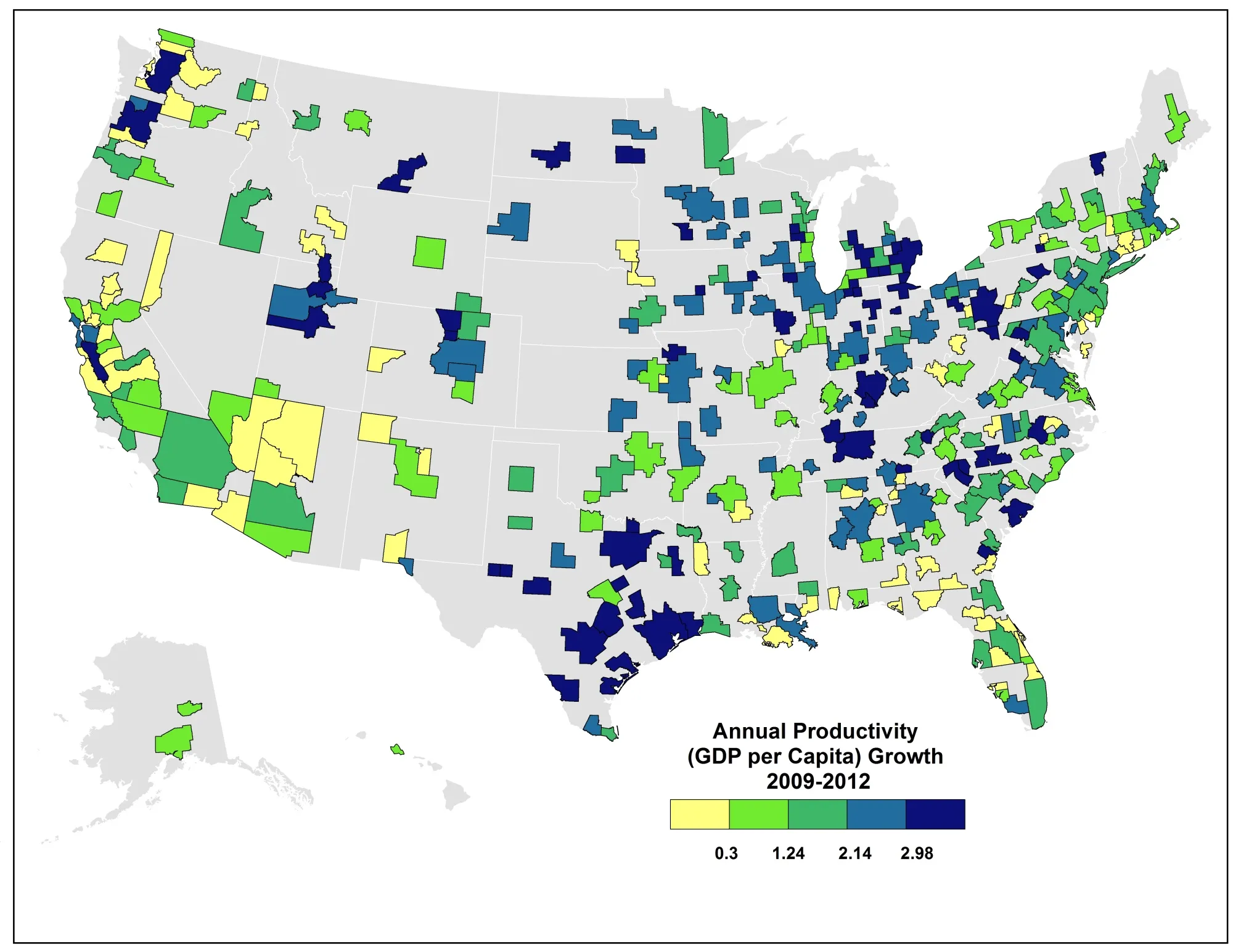 第二张地图(上面)显示了美国大都市地区从2009年到2012年的生产率增长率——以人均GDP衡量。在全国范围内,这一时期大都市年化生产率增长的平均值为1.74%。84%的大都市经历了正的生产率增长,而47%的大都市的增长超过了美国的平均水平。在这一时期经历生产率增长的大都市中,仅有40%的人口增长率超过了1%。
