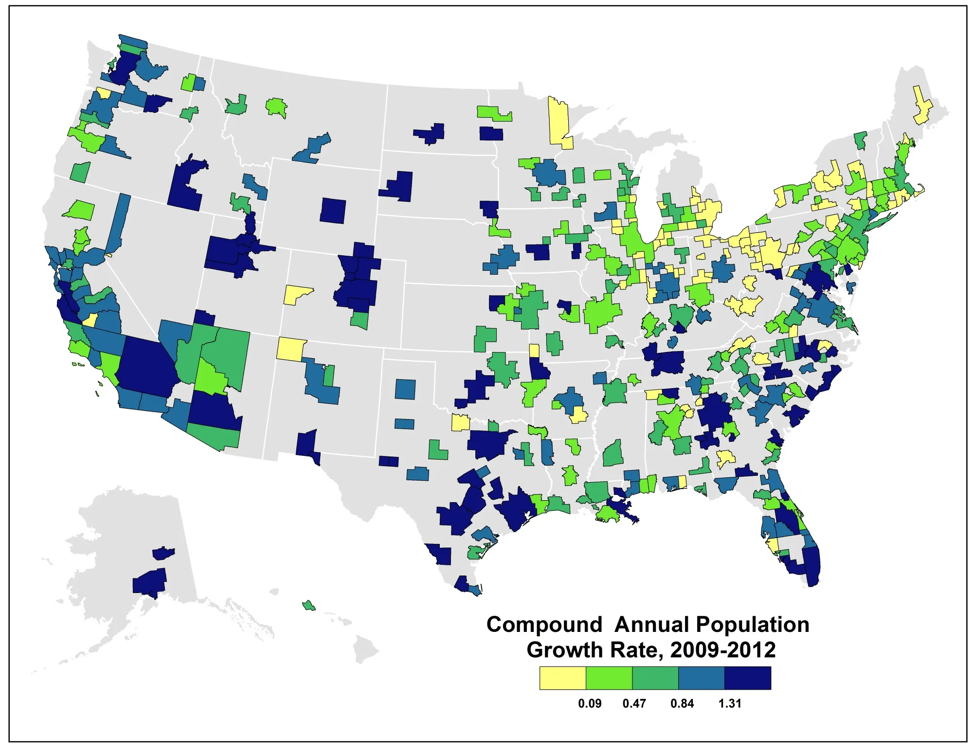 上面的地图显示了2009年至2012年各城市地区的平均年人口增长。