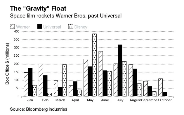 桑德拉·布洛克在 重力照片由华纳兄弟影业通过埃弗雷特收藏提供这部太空惊悚片 重力 帮助华纳兄弟在票房销售的高空中进一步领先于环球影业。