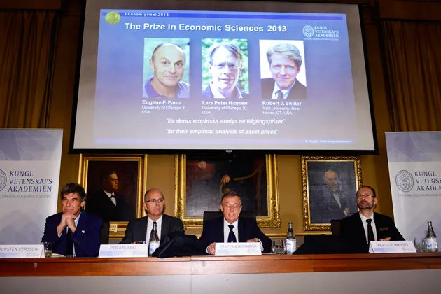 2013年诺贝尔经济学奖的获奖者于10月14日在瑞典皇家科学院宣布摄影:TT/Claudio Bresciani/AP照片罗伯特·希勒, 非理性繁荣的作者,是世界上领先的金融市场泡沫理论阐述者之一。尤金·法马表示他甚至不知道什么是泡沫。