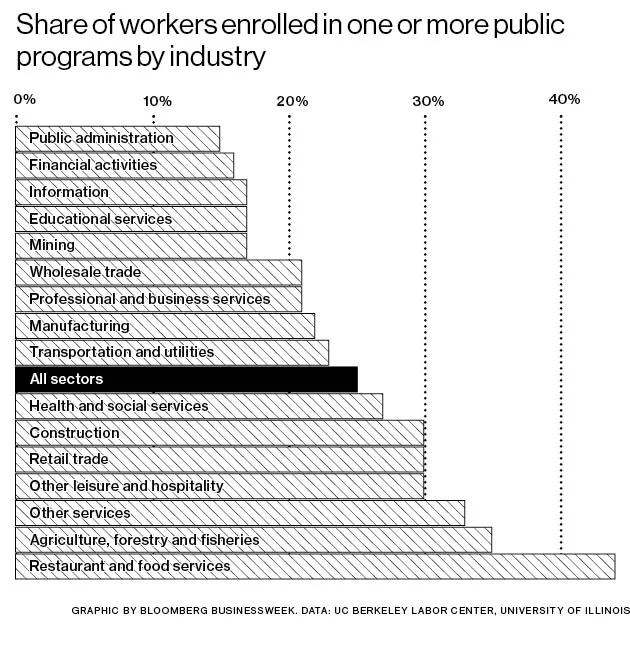 总体而言,52%的快餐工人的家庭参加了一个或多个公共援助项目,而整个劳动力的比例为25%。医疗补助和儿童健康保险计划占据了70亿美元中的近40亿美元。所得税抵免、食品券和临时援助计划占据了其余部分。“公共福利的领取对于这个劳动力来说是常态,而非例外,”作者们写道。