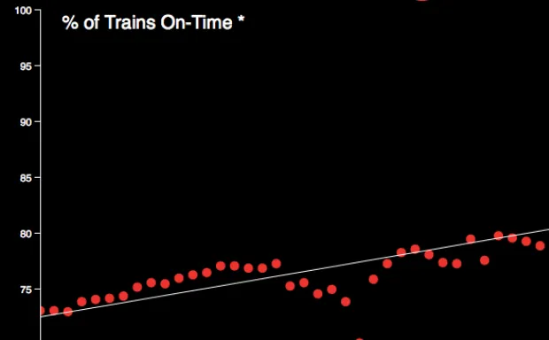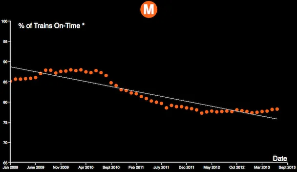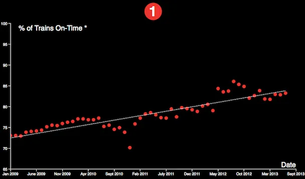 实际上,许多城市都有实际的性能数据,跟踪公共交通的准时频率。纽约市的大都会运输署 发布了一项指标,称为 “等待评估”,记录了火车在城市地铁系统中准时到达的频率。它反映了某条线路上按计划间隔时间(加减25%)到达的火车百分比。