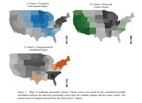 这项研究基于从五个独立的互联网调查样本中收集的广泛数据和信息,历时12年,涵盖了150万人,分布在48个相邻州。根据研究人员的说法,研究的主要目标是绘制“美国的心理地形”,由“地理上连贯的心理区域”组成。为此,他们使用了一种称为“聚类分析”的统计技术,研究五大人格特质——开放性、责任心、外向性、宜人性和神经质——在美国各州和地区的分布和聚集情况。