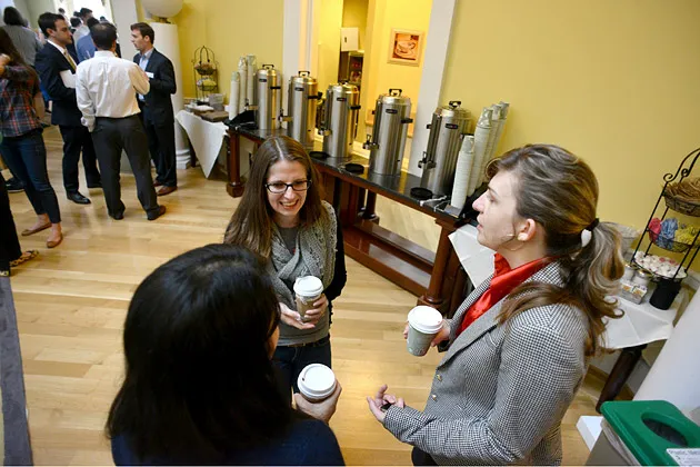 一群在弗吉尼亚大学达登商学院的第一年MBA学生在10月17日于弗吉尼亚州夏洛茨维尔的第一次咖啡会上聊天。感谢Fareine Benz,达登商学院每天早晨在当天的第一节课后,学生、员工、教职工以及任何恰好在弗吉尼亚大学的 达登商学院 聚集在一起,进行半小时的咖啡时间,这一传统可以追溯到学校成立近60年前。恰如其分地,这被称为第一次咖啡。