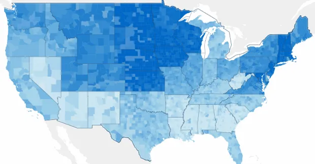 上述每年更新的地图试图捕捉人们向上流动的机会。在这第三版刚发布的版本中,内华达州再次被评为机会最少的州(今年佛蒙特州机会最多)。上述地图(以及下面的地图)中较深的阴影对应于更高的分数。