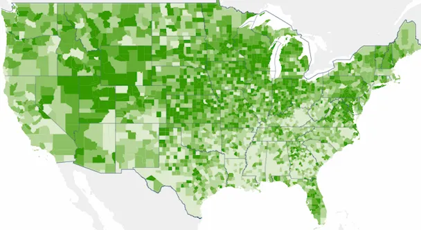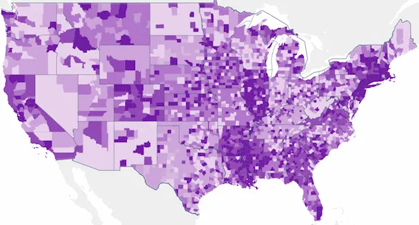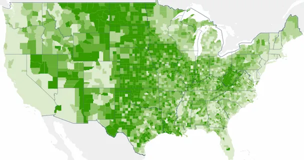 您可以在这里查看 完整的数据和方法论。该工具还绘制了16个指标的地图,这些指标基于来自人口普查局、劳工统计局、美国教育部等的数据。许多主要城市在医疗保健的可及性等指标上表现良好(深红色县每10万居民中拥有最多的初级保健提供者):