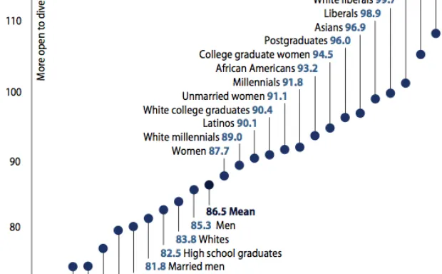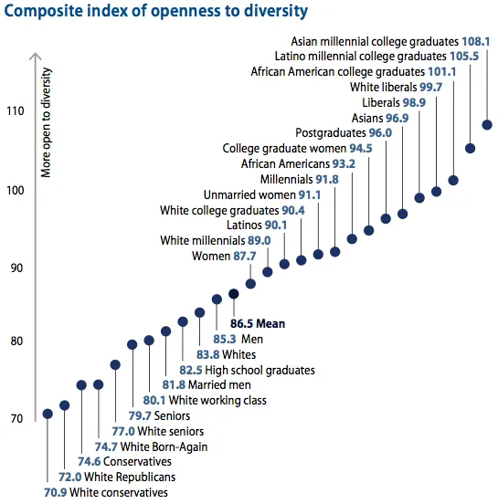 总体而言,报告的作者强调,美国人对多样性的好处持更乐观的态度 – 并且更愿意投资于减少种族群体之间的不平等 – 而不是“在政治和媒体中常常描绘的那样。”但不同人口群体的反应也在显著方面有所不同,这表明那些最受现状变化威胁的群体(工人阶级白人和老年人)对人口变化的热情最低。该报告根据16个关于该主题的问题构建了一个160分的“对多样性开放程度”综合指数,结果如下: