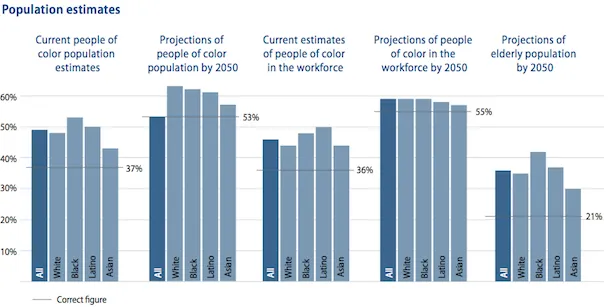关于多样性,这种基线误解为一些其他民调结果提供了有用的背景,例如,54%的人担心在一个日益多样化的美国中,工作机会不足,或者47%的人认为日益增长的多样性会导致犯罪和邻里问题增加,或者62%的人认为因此对政府服务的需求会过多。很可能,许多人设想的这些恐惧根源的社会变化是更为戏剧性 – 并且是直接的 – 而不是实际上即将到来的变化。