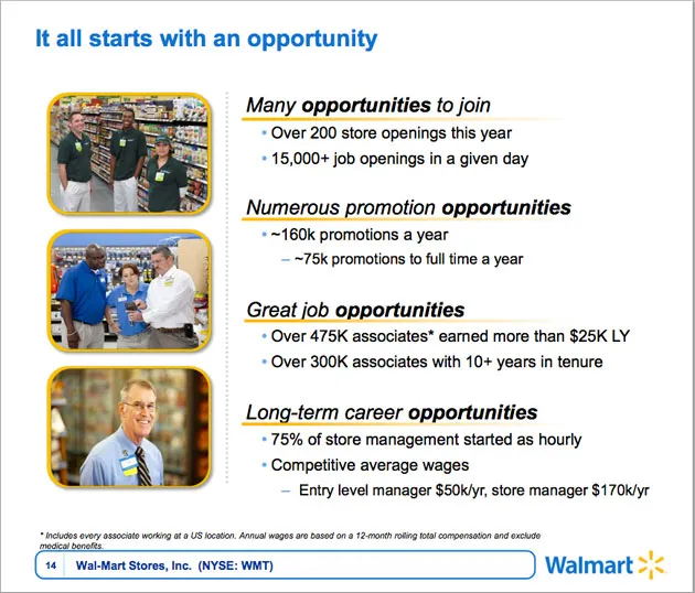 “我们有数十万名员工的年薪在25,000美元或以上,”沃尔玛发言人科里·伦德伯格说。“对于那些没有达到这个水平的人来说,成长为他们想要的职业的机会是存在的。我们每年提拔16万人。”伦德伯格还解释了如何解析沃尔玛的一些数据。该公司有130万名小时工,这使得我们的沃尔玛在新闻发布会上声称其中有825,000人年薪低于25,000美元。伦德伯格指出,西蒙的演示是指在商店工作的100万人。(其余的在卡车司机和阿肯色州本顿维尔总部等其他地方工作。)因此,大约52%的员工年薪低于25,000美元,而不是63%。
