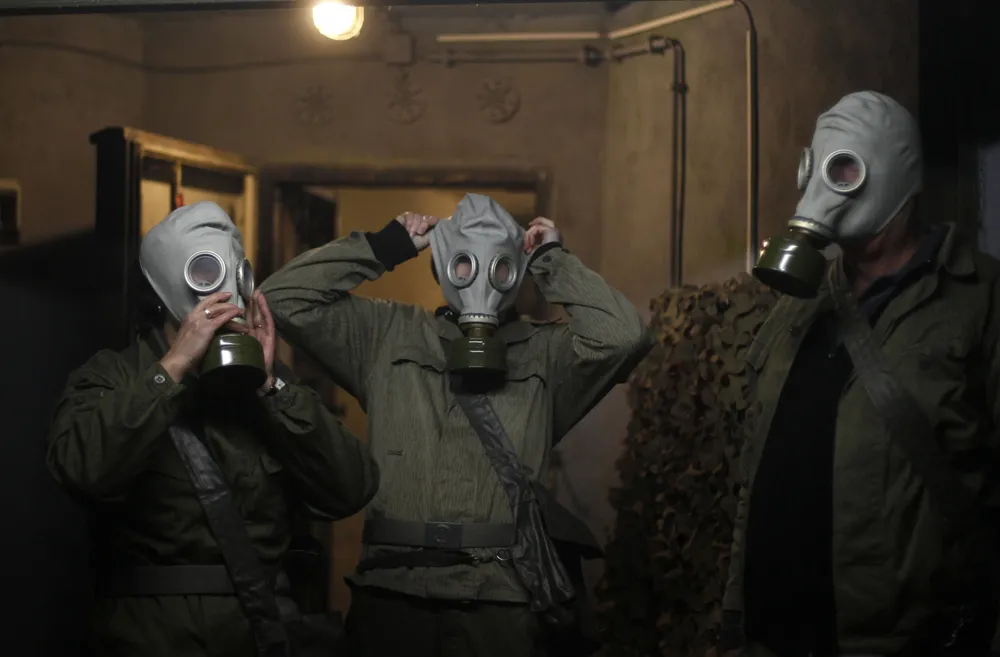 穿着NVA士兵制服的女性在“碉堡博物馆”的“现实活动”中准备晚餐,时间为2013年10月12日。路透社/Ina Fassbender