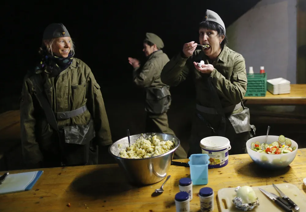 穿着NVA士兵制服的女性在“碉堡博物馆”的“现实活动”中准备晚餐,时间为2013年10月12日。路透社/Ina Fassbender
