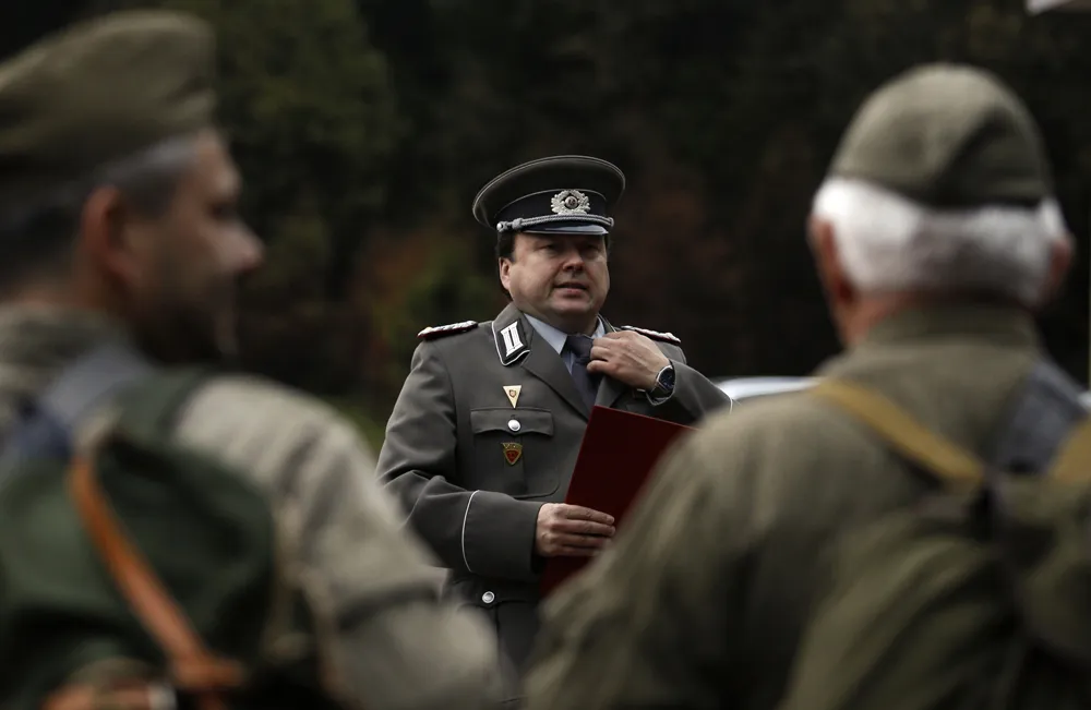 一名穿着NVA少校制服的男子与“碉堡博物馆”一夜“现实活动”的参与者交谈,时间为2013年10月12日。路透社/Ina Fassbender