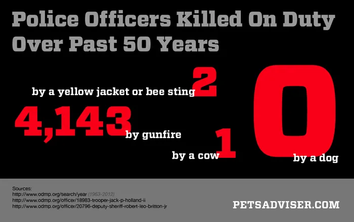 Petsadvisor.com,一个主要批评执法暴力对待狗的组织,发布了一张信息图,显示了相反的统计数据:有多少警察被狗杀死。
