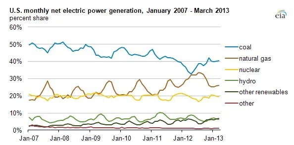 尽管美国人消耗的电力略有减少,但排放量的下降主要是由于天然气取代了煤炭。到2012年4月,天然气已与煤炭在电力来源上达成平价。然而,自2012年11月以来,煤炭正在复苏,这要归功于其超低价格。根据能源信息管理局的数据,煤炭现在每月产生40%或更多的国家电力,2013年是否会因此带来温室气体排放的轻微上升将是一个有趣的观察。
