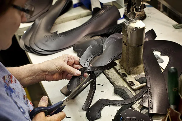 艾伦·爱德蒙兹并不便宜或临时,该公司自1922年以来一直在威斯康星州波特华盛顿制造鞋子,位于密尔沃基以北。周日,他们的工人支持包装工队;周一,他们手工切割皮革,并在几十年的缝纫机上缝制鞋子。他们用加热的软木涂抹每双鞋的鞋底,这最终会模具成个人的脚型。价格范围从115美元(棒球缝合休闲男士船鞋)到695美元(道尔顿小牛皮靴);其畅销款在中间(第五大道尖头牛津鞋:345美元)。