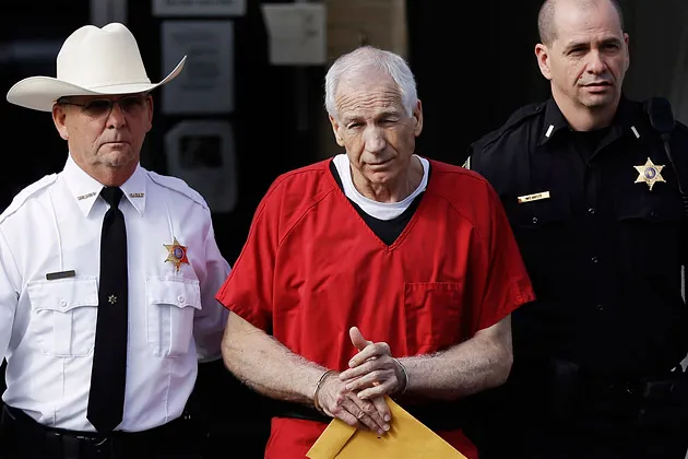 前宾夕法尼亚州立大学助理足球教练杰瑞·桑杜斯基(Jerry Sandusky)在2012年10月9日被判刑后,从中心县法院被带出照片由马特·鲁尔克(Matt Rourke)/美联社提供宾夕法尼亚州立大学在桑杜斯基虐待丑闻的深渊中迈出了重要一步。学校确认今天将支付5970万美元以解决26名遭受前助理足球教练杰瑞·桑杜斯基性侵的受害者提起的诉讼。