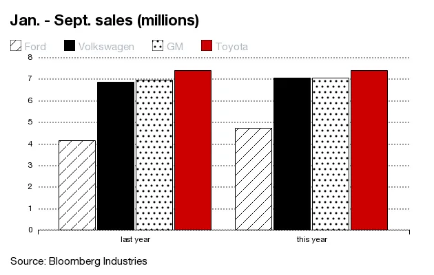 在今年的前九个月,丰田售出了741万辆汽车和轻型卡车,而通用汽车为725万辆,大众汽车为703万辆。以下是这三家公司在进入年末最后两个月时的竞争情况: