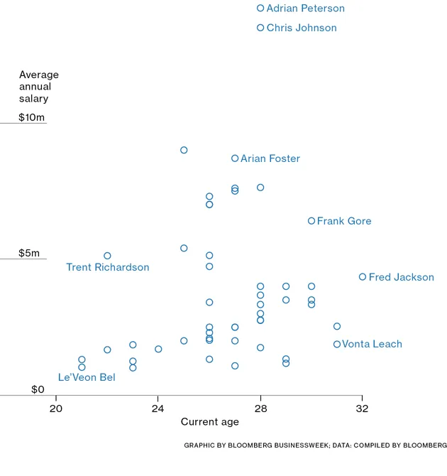 以下是联盟中薪水最高的50名跑卫的图表,比较了他们当前的年龄。