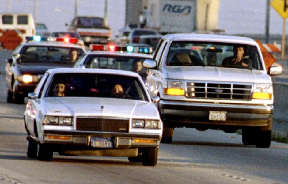 顶部图片:1994年6月17日,福特布朗科载着O.J.辛普森(隐藏在后座)在洛杉矶地区高速公路上被数十辆警车追逐,持续了一个小时。(美联社)