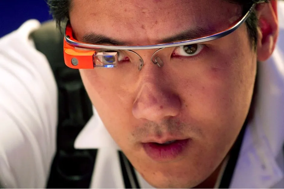 文森特·阮,SlashGear的主编,在2013年9月23日星期一于纽约报道微软Surface 2的发布时佩戴了谷歌眼镜。马克·伦尼汉/AP来自加利福尼亚圣地亚哥的塞西莉亚·阿巴迪可能是第一位因佩戴谷歌眼镜而被开罚单的人。