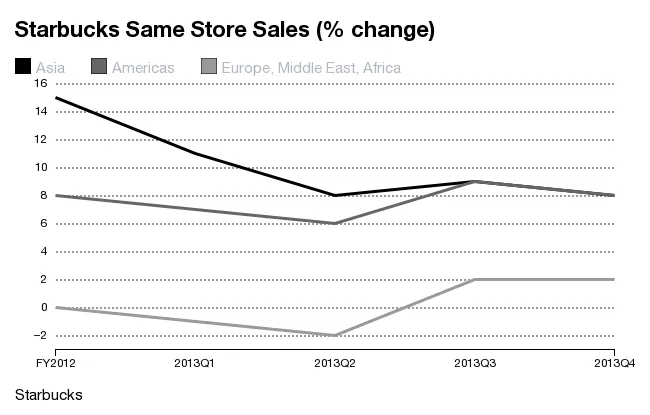 星巴克上个季度在亚洲的营业利润率为37.5%,而美洲为21.8%。2013财年,亚洲的同店销售增长了9%,是各地区中最高的,尽管这一增速在一年中有所放缓。