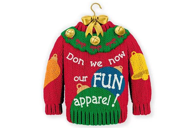 如果Hallmark担心“同性恋服装”会冒犯人们——显然会——那么正确的做法可能是完全避免这句歌词。该公司本可以发布一个没有任何文字的毛衣形状的装饰品,就像它显然在2003年所做的那样。