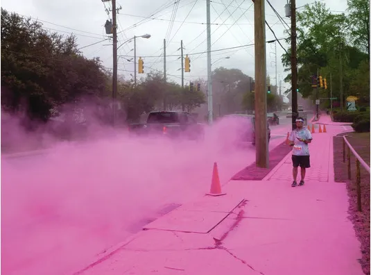 比赛结束后,街道上留下覆盖一层厚厚的彩色尘埃。虽然粉末只是染色的玉米淀粉,但它仍然留下了干尘(行人和交通扬起)和湿尘(污垢和排水沟上留下污渍)的挑战组合。2012年亚特兰大比赛后的清理工作需要25名工人和四台高压清洗机。