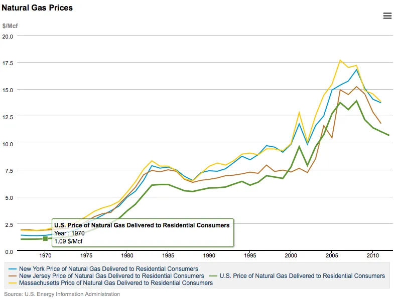 纽约、新泽西和马萨诸塞州的家庭支付的天然气价格高于美国其他地区。数据:EIA