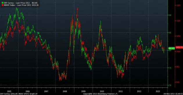 我创建了这两个指数的图表,发现它们的走势非常接近。不过,确实会出现差距。例如,在10月22日,ICE的美元指数年初至今下跌了0.7%,而彭博的上涨了1.4%。这让人困惑,是吧?一个拥有一块手表的人总是知道现在几点。一个拥有两块手表的人则永远不太确定。