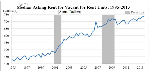 该图表没有考虑通货膨胀(如果只显示纽约市或旧金山,而不是整个国家,显然会看起来不同),但我们可以自己进行 一些粗略计算。如果你在1995年每月支付约425美元,那么今天的租金——在其他条件相同的情况下——大约是650美元。然而,截至今年第三季度,中位数要价为736美元。