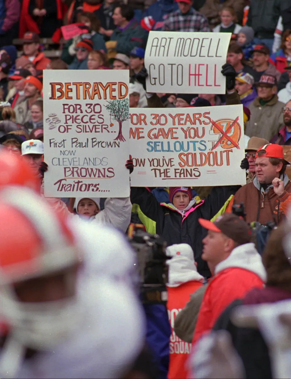 1995年11月6日的公告是在巴尔的摩的卡姆登园区前发布的,距离莫德尔将要获得他想要的新体育场只有几步之遥。巴尔的摩的 NFL球队在十年前的深夜离开。尽管有这种共同的创伤,马里兰州的政治家们在新闻发布会上仍然难以掩饰他们对窃取另一个城市球队的兴奋。巴尔的摩新闻发布会后一天,克利夫兰的选民批准了一项公投,将 为体育场的翻新提供资金。对莫德尔来说,这一切来得太少,太晚。