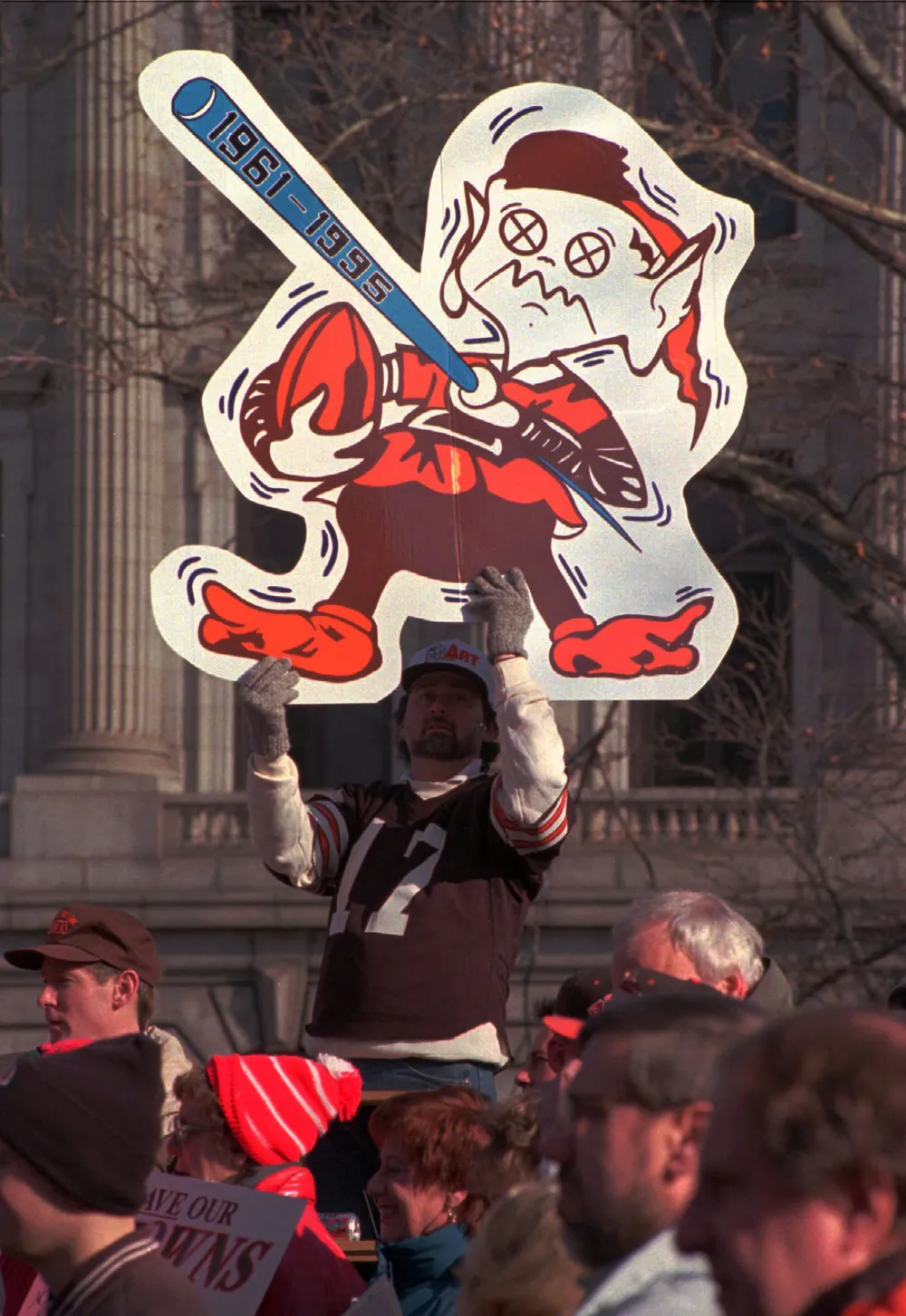 克利夫兰市长迈克·怀特在1995年11月13日星期一,在匹兹堡与其他克利夫兰布朗队的球迷一起示威,比赛对手是钢人队。布朗队的老板打算将球队迁往巴尔的摩。美联社照片/基因·J·普斯卡尔