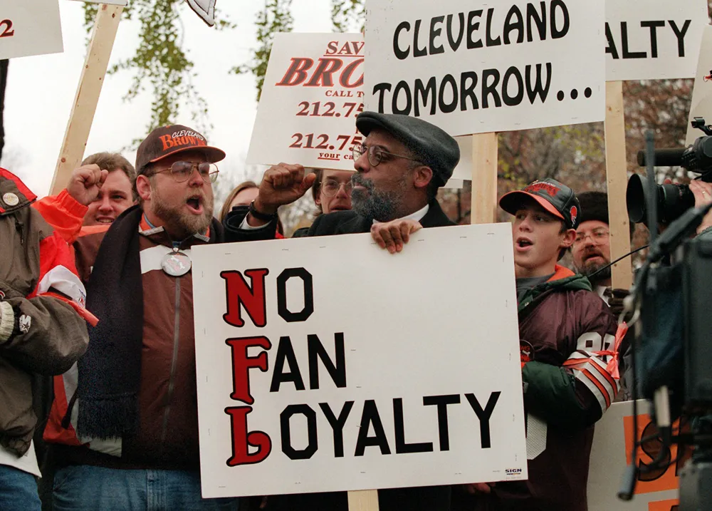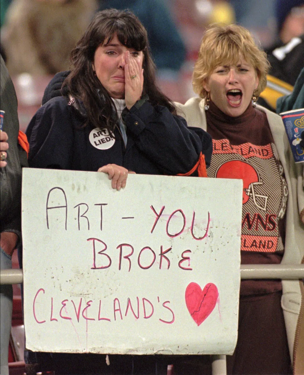 美联社在勒布朗·詹姆斯在电视上宣布他将把才华带到其他地方的几年之前,被称为“克利夫兰体育迷”的情感受损群体观看他们的足球老板在巴尔的摩市中心宣布他将 搬迁这支已有49年历史的球队。