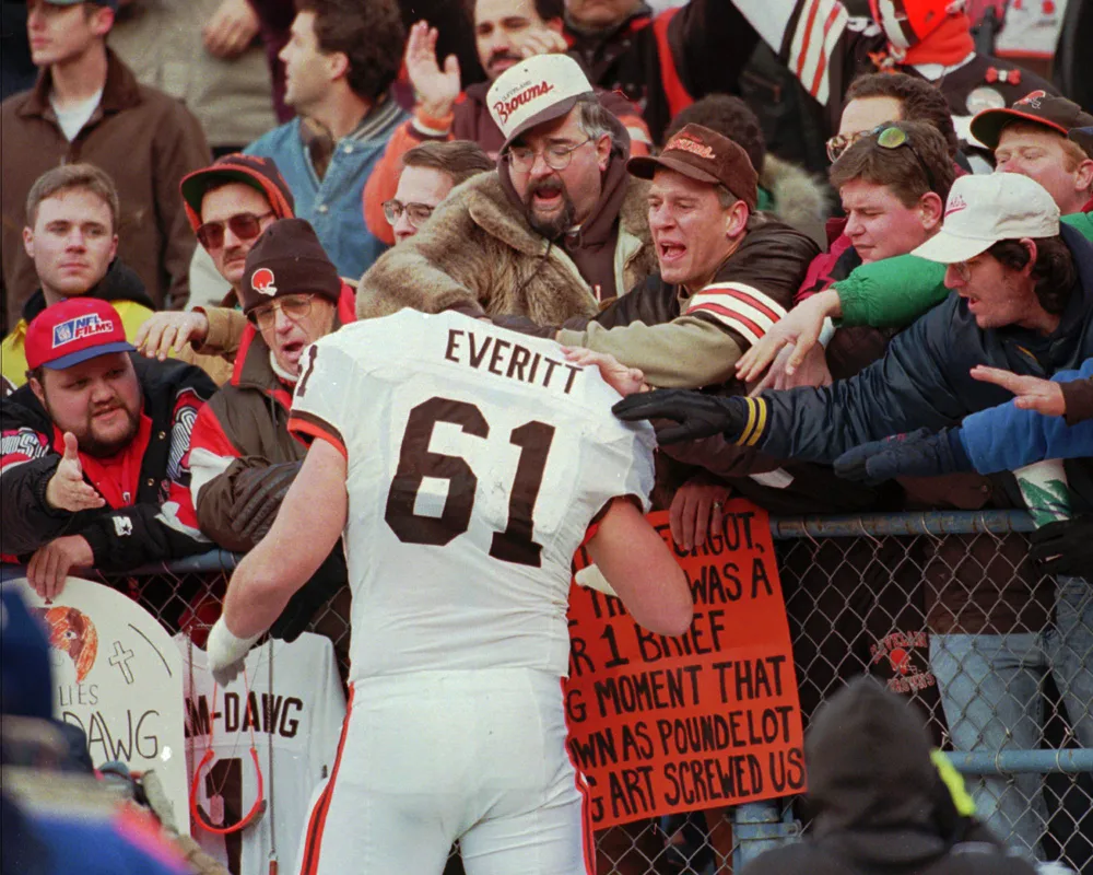 克利夫兰布朗队中锋史蒂夫·埃弗里特(61号)在1995年12月17日星期天访问克利夫兰体育场的“狗窝”时受到球迷的欢迎,比赛对手是辛辛那提孟加拉虎队。美联社照片/托尼·德贾克