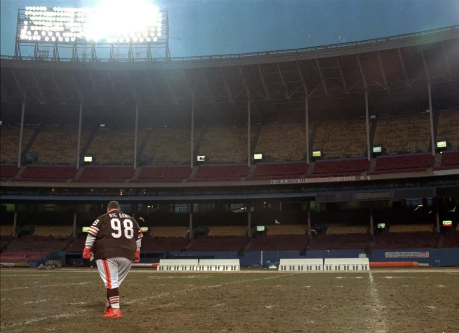 克利夫兰布朗队超级球迷“巨犬”,即约翰·汤普森,在1995年12月17日布朗队以26-10战胜辛辛那提猛虎队后,走过克利夫兰体育场的空旷球场。美联社照片/托尼·德贾克