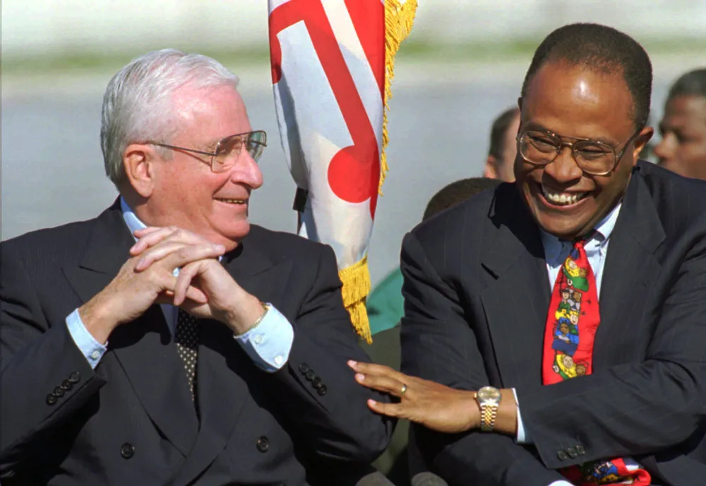 克利夫兰布朗队老板阿特·莫德尔(左)和巴尔的摩市长库尔特·施莫克在1995年11月6日星期一的新闻发布会上分享笑声,正式宣布布朗队迁往巴尔的摩。美联社照片/特德·马蒂亚斯