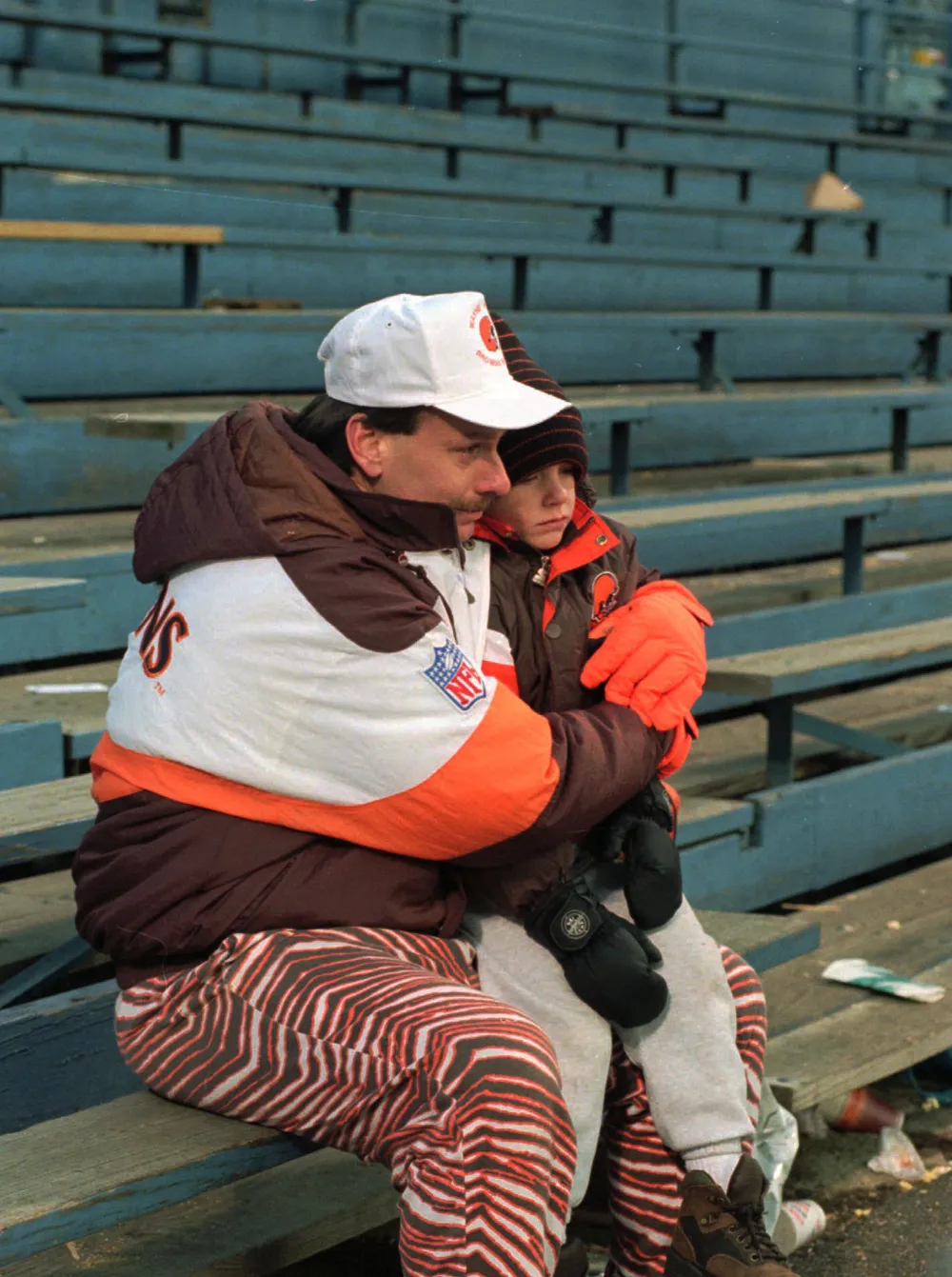 左:吉姆·斯坦珀在1995年12月17日星期天的“拯救我们的布朗队”集会上举着标语,地点在克利夫兰体育场,比赛对手是孟加拉虎队。右:乔·沙帕卡在1995年12月17日星期天的克利夫兰布朗队与辛辛那提孟加拉虎队比赛后,抱着他六岁的儿子马修,坐在克利夫兰体育场的看台上。美联社照片/杰夫·格里登