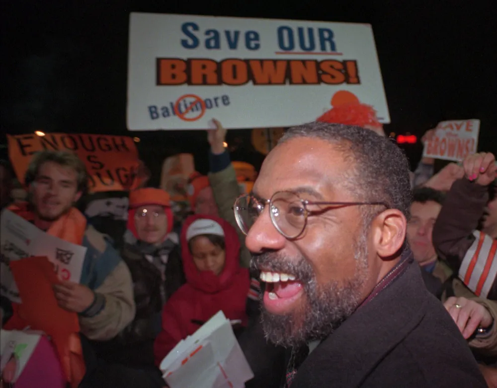 克利夫兰市长迈克·怀特在1995年11月13日星期一,在匹兹堡与其他克利夫兰布朗队的球迷一起示威,比赛对手是钢人队。布朗队的老板打算将球队迁往巴尔的摩。美联社照片/基因·J·普斯卡尔