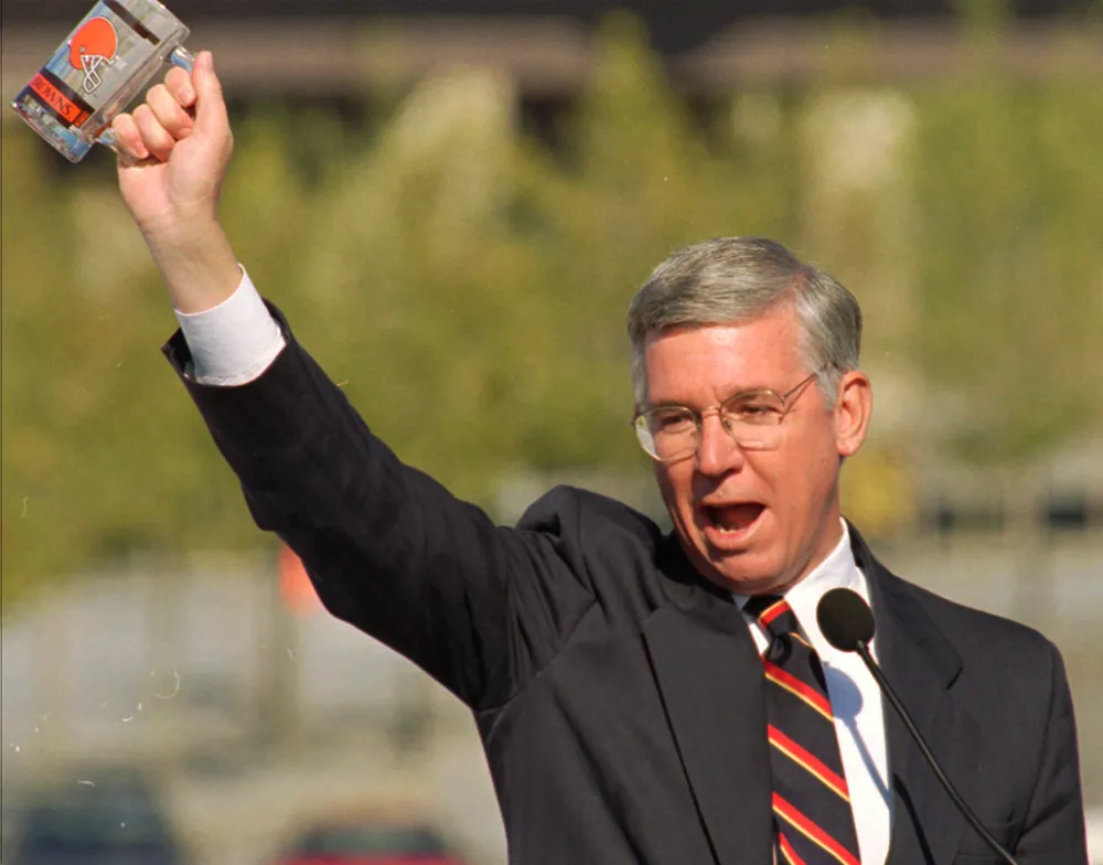马里兰州州长帕里斯·格伦登宁在1995年11月6日星期一的新闻发布会上挥舞着克利夫兰布朗队的杯子,宣布布朗队已同意迁往巴尔的摩。美联社照片/泰德·马修斯
