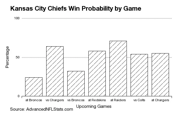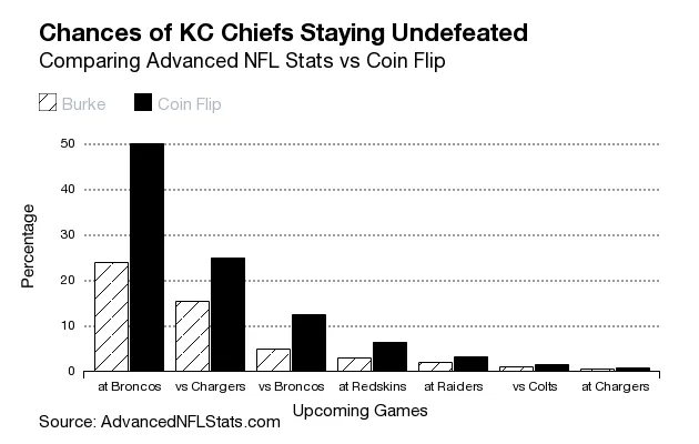 我们知道足球比赛的结果不是抛硬币的结果,因此,让我们考虑一种更先进的预测方法。布莱恩·伯克,恰如其名的网站 AdvancedNFLStats.com 的创始人,计算了酋长队在最后七场比赛中的预期胜率,基于多种因素,包括团队效率的衡量、进攻和防守的强项和弱项,以及失误的影响。