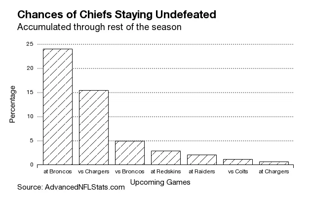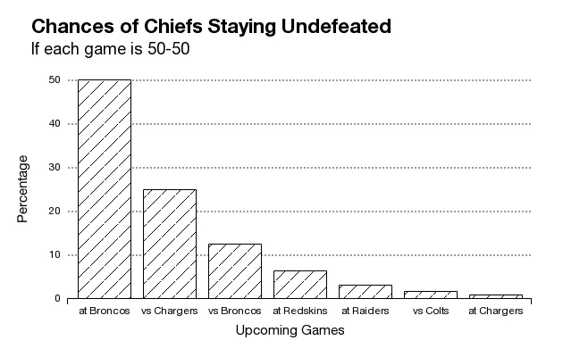 估算这种概率最简单的方法是将每场比赛视为50-50的抛硬币。酋长队保持不败的几率在第一周为50%,第二周为25%,依此类推。根据这个估算,酋长队在接下来的七场比赛中保持不败的几率仅为0.78%——即50%的7次方。