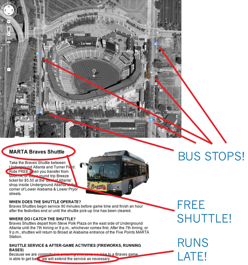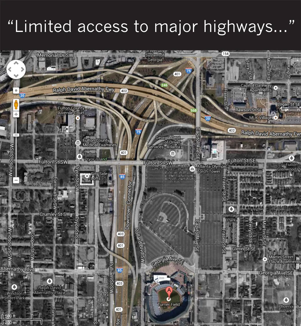 尽管亚特兰大并不以出色的公共交通而闻名,特纳球场距离最近的MARTA车站步行25分钟,多个公交线路经过,并且在比赛日有免费的(!)市区班车。确实,这可能不是理想的,但他们下一个体育场的地点公共交通更糟。考布县似乎主要关注为勇士队的到来创造以汽车为导向的交通改善,尽管他们确实表示已经开始规划有限的地方电车线路。
