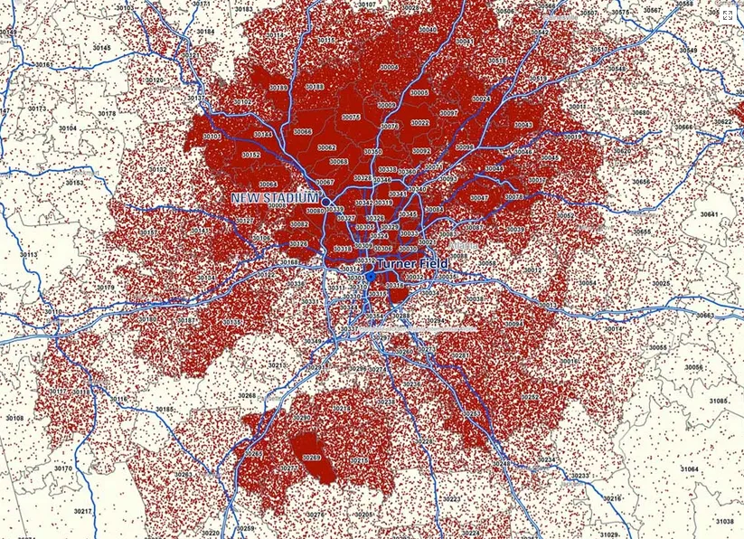 在他们的网站上,球队还发布了一张地图,显示了考布县设施将如何更好地满足其核心球迷群体,购票者主要集中在市中心以北的区域: