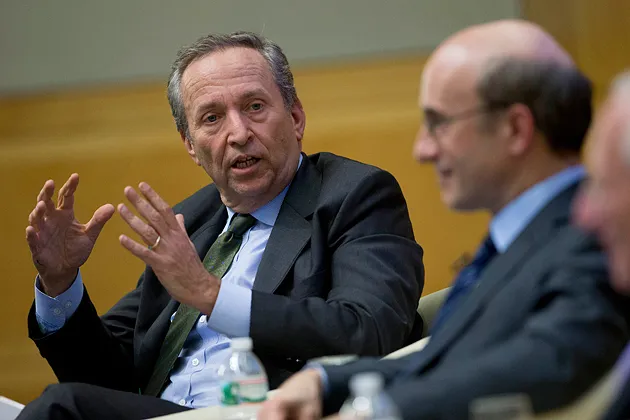 拉里·萨默斯,左侧,2013年11月8日在华盛顿国际货币基金组织举行的雅克·波拉克年度研究会议上摄影:安德鲁·哈雷尔/彭博社 11月15日,下午3点:更新以添加哈佛大学财务主管和哈佛公司高级研究员的回应。