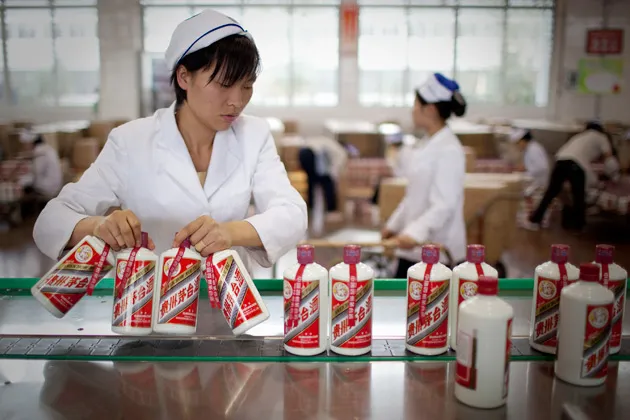 工人在中国贵州包装中国贵州茅台酒摄影:Nelson Ching/彭博社贵州茅台是中国白酒的主要生产商,这是一种由发酵高粱蒸馏而成的清澈而强烈的酒,通常酒精含量在35%到53%之间。贵州这家公司的标志性酒品长期以来一直是中国共产党宴会的主打,直到最近,这一事实保证了健康的销售额。