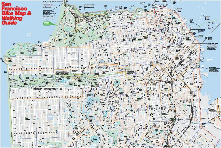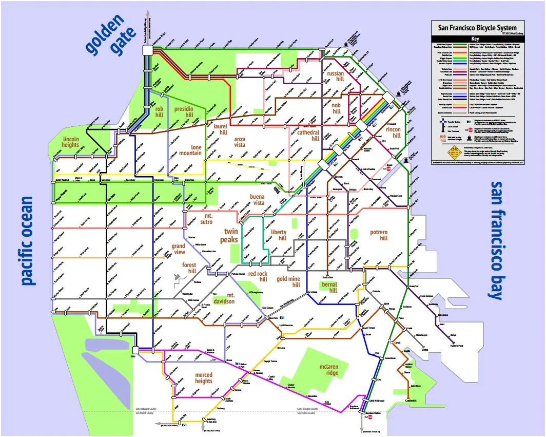 当你查看这张充满爱意细节但让人眼花缭乱的自行车和步行地图时,他的论点很容易理解,来自 旧金山自行车联盟: